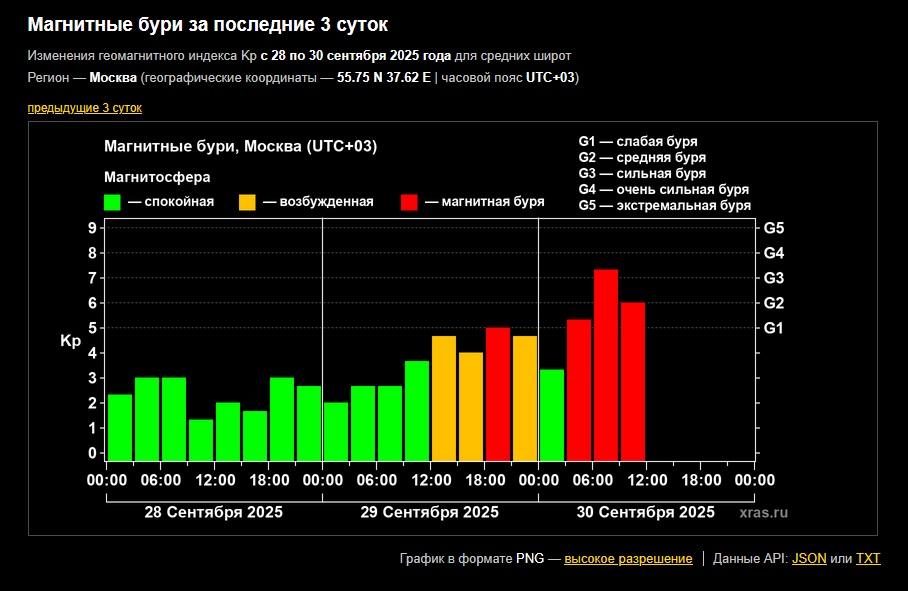 Как сообщают специалисты Лаборатории солнечной астрономии ИКИ РАН, ранним утром индекс геомагнитной активности на Земле увеличился до уровня 7.33, что говорит о сильной магнитной буре категории G3 и даже больше по 5-балльной шкале. Потом активность чуть спала, но шторм еще продолжается.