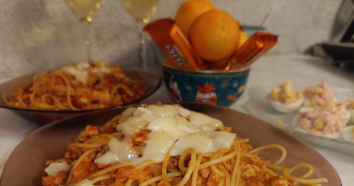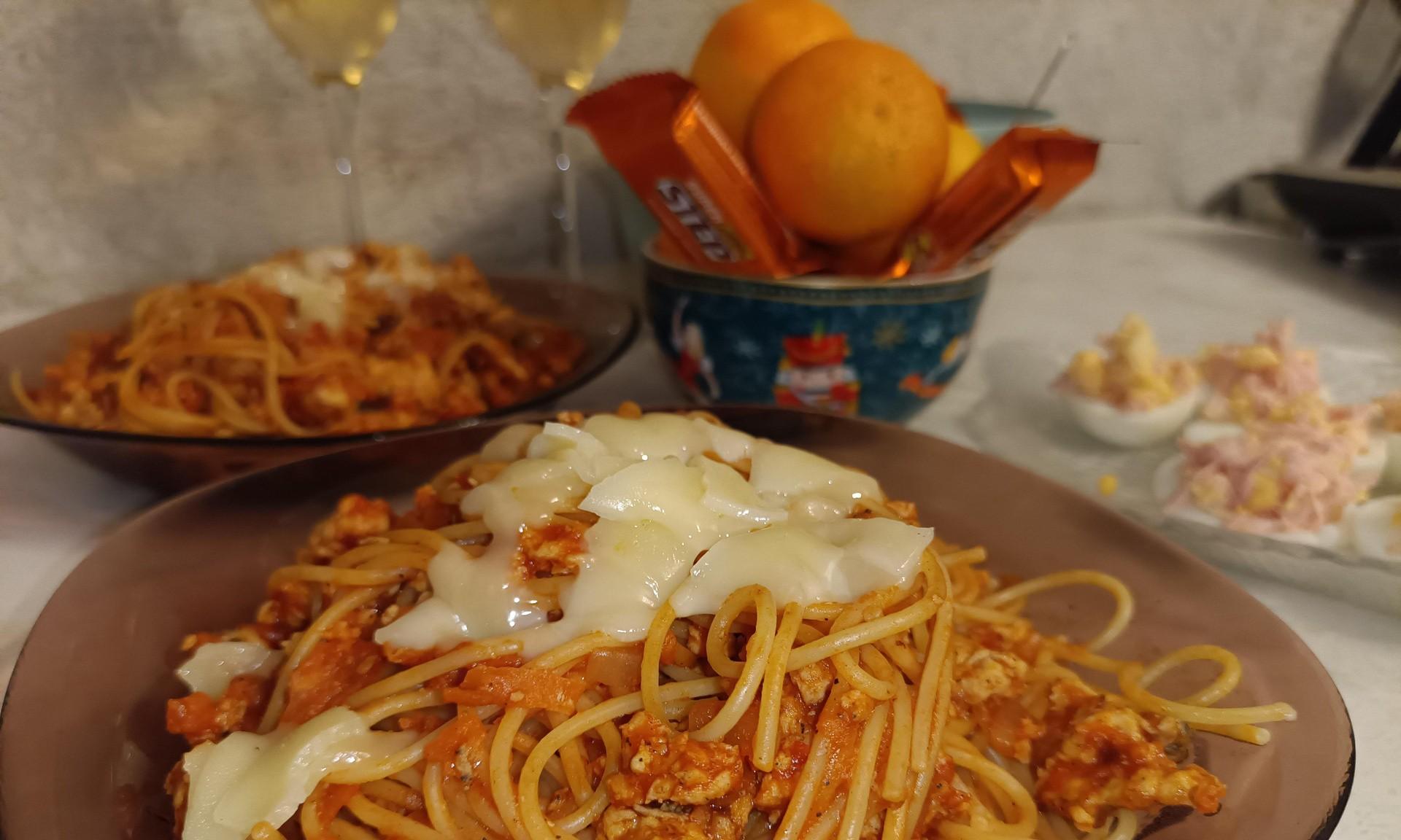 Для пасты натерла морковь и нарезала лук, обжарила на сковороде, затем добавила к ним фарш. Параллельно отварила макароны. Затем добавила в готовое мясо томатную пасту, черный перец и немного воды от варки макарон. Затем смешала пасту с соусом, овощами и мясом. В готовое блюдо добавила оставшийся сыр.