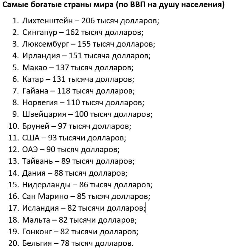 Самой богатой страной мира считается Лихтенштейн, за ним следуют Сингапур и Люксембург.