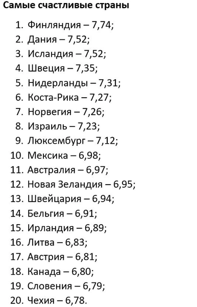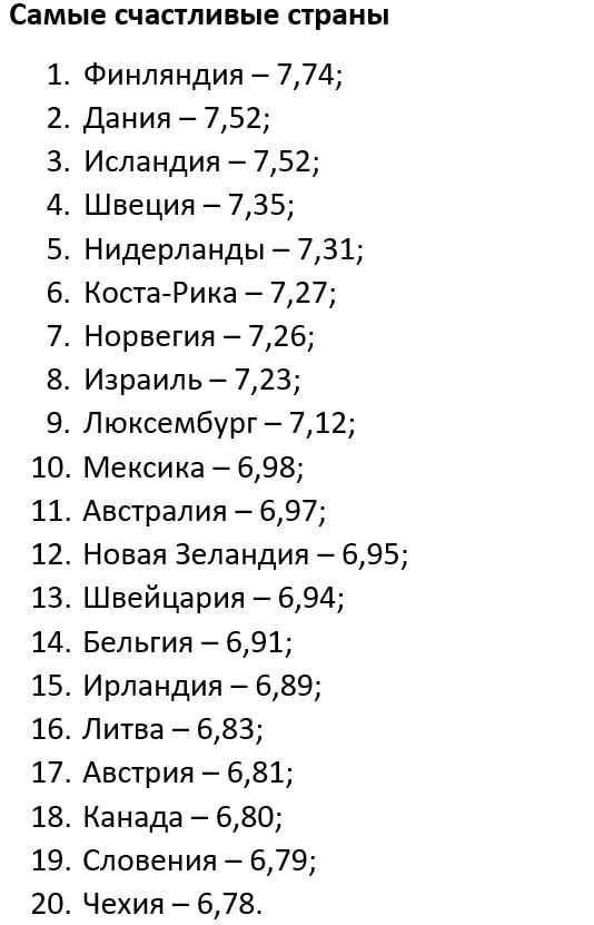 Однако в лидерах рейтинга по уровню счастья можно заметить Финляндию, которая даже не вошла в топ-20 самых богатых стран. За ней идут Дания и Исландия — северные государства, которые, впрочем, славятся своей системой социальной защиты.