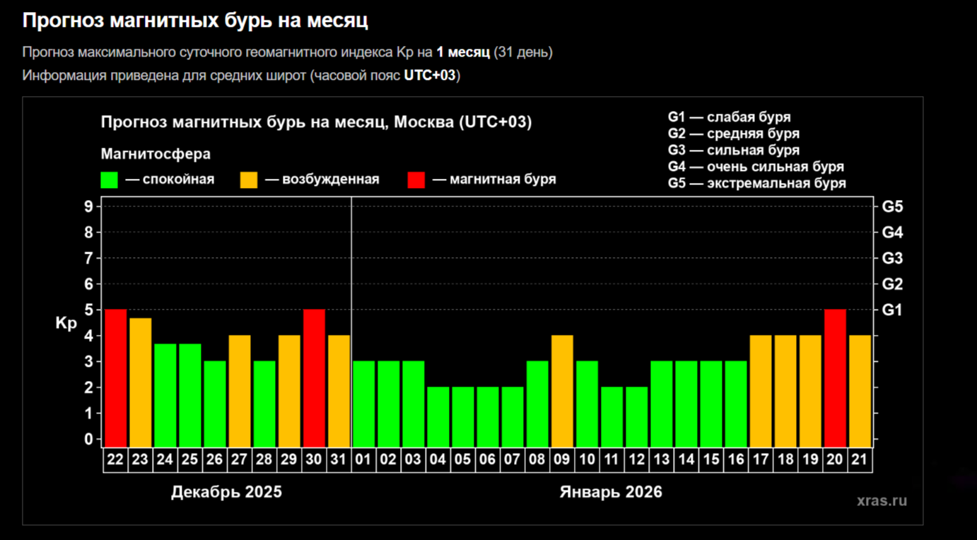 31 декабря магнитосфера обещает быть возмущенной. Магнитное поле станет «разгоняться», говорят астрономы. Пока что прогноз показывает, что до магнитной бури не дотянет, а 1 января и вовсе всё должно быть спокойно.