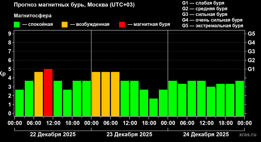 Уже сегодня, 22 декабря, магнитосфера неспокойна с самого утра. Согласно расчетам специалистов, магнитная буря должна разгуляться к обеду. Астрономы предрекают ей уровень G1, что трактуется как «слабая буря».