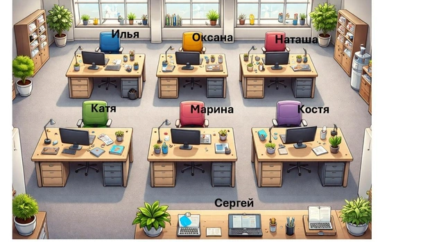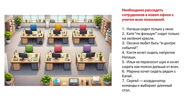 Суть задачки проста — рассадить сотрудников в новом офисе с учетом всех их пожеланий. На первый взгляд она кажется легкой, но на деле потребует немного подумать и учесть сразу несколько факторов. После длинных выходных нам тоже сложно включиться одной кнопкой: мозгу нужно время, чтобы заново выстроить связи и приоритеты.