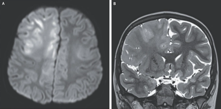 МРТ головного мозга показала отек и ограничение диффузии в лобных долях, которые охватывали кору и белое вещество, распространяясь в мозолистое тело. На электроэнцефалограмме (ЭЭГ) с обеих сторон медики также выявили комплексы Радермекера — так называют признаки на ЭЭГ, которые характерны для некоторых видов энцефалопатий.